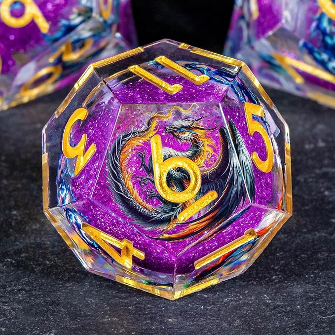 OUKELANWO Liquid Core Dragons Stickers DND Dice Set D&D, 7Pcs Dungeons D and D Role Playing Dice with Gift Box, Resin Sharp Edge Dice D20 D12 D10 D8 D6 D4, Purple Gold