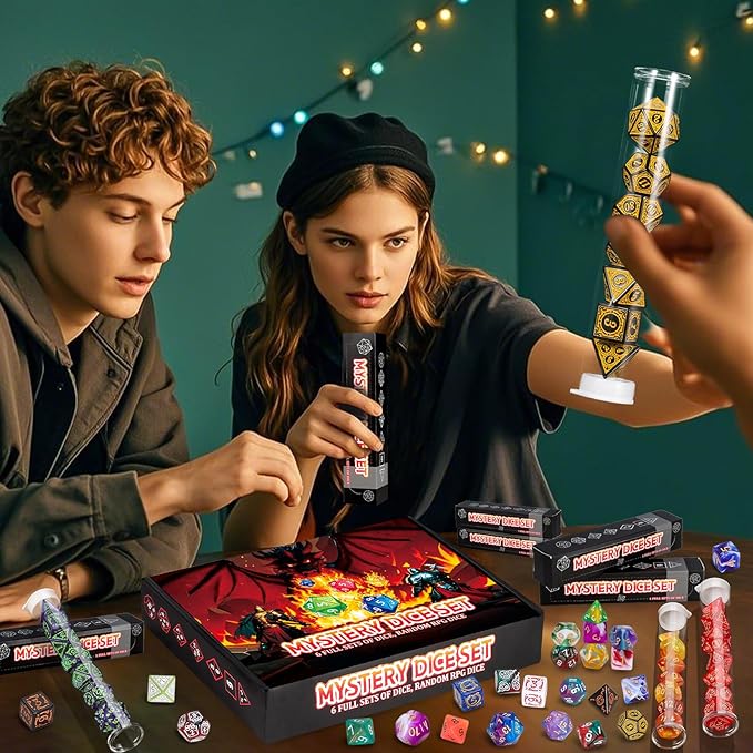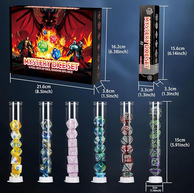 - Surprise Mystery Dice Box: QMAY Mystery Dice has OVER 100 styles dice, you will get 6 random sets of polyhedral dice and 6 dice display tubes. What style of dice will you get? Come on, enjoy the surprise and fun brought to you by QMAY Mystery Dice Gift Box!