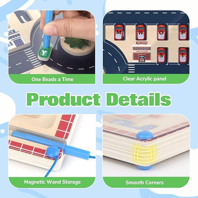 - ๐คด๐ ฟ๏ธใExplore the Fun Alphabet and Colours Mazeใ Alphabet learning toys features a 26-space parking lot and matching alphabet car. Four scenes are cleverly designed based on life: school, police, fire station, and trash, and corresponding vehicles are matched for each scene. Children can use the magnetic wand to move the alphabet car to the corresponding parking space, during which they learn letter recognition, color recognition, puzzle solving and fine motor skills in a fun and enjoyable way!