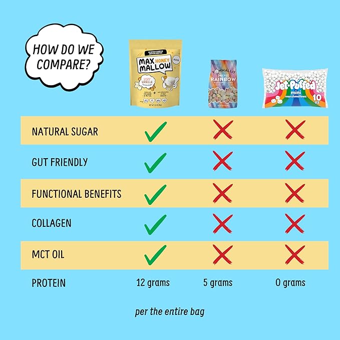 - GLUTEN-FREE, ZERO FAT & ONLY 5 INGREDIENTS – A wholesome alternative to traditional mass-produced marshmallows, crafted without gluten, fat or refined sugars for a worry-free indulgence.