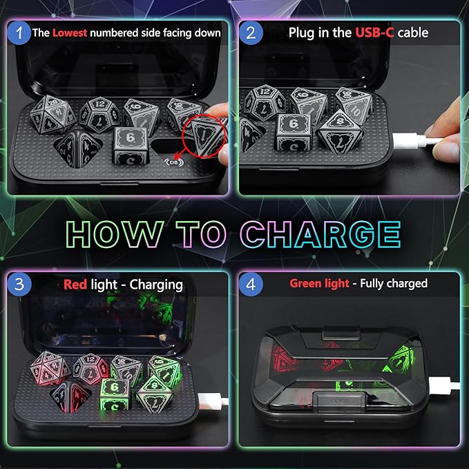 - 4 in One Color LED Dice: The dnd dice feature an upgraded charging system - Simply place the highest-numbered side up in the charging case and insert Type-C port. No more contact-point charging issues found in traditional LED dice