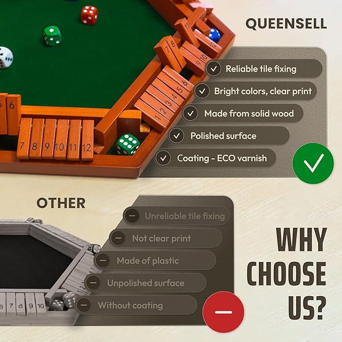 Queensell Shut The Box Game 12 Numbers for 1-6 Players - 16-inch Wooden Board Shut The Box Game 12 Numbers for Adults & Kids - Ideal for Games Night