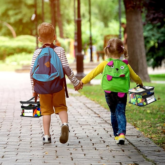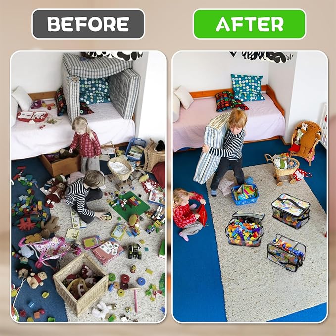 - Design Updates: Our new transparent PVC toy organizers and storage bag is equipped with top and side handles, which has a stronger load-bearing capacity and is convenient for carrying and small space storage; it is equipped with a name tag and instruction manual pocket, so that children can easily check and find the toys they need; the double zipper design can be fully opened for easy storage