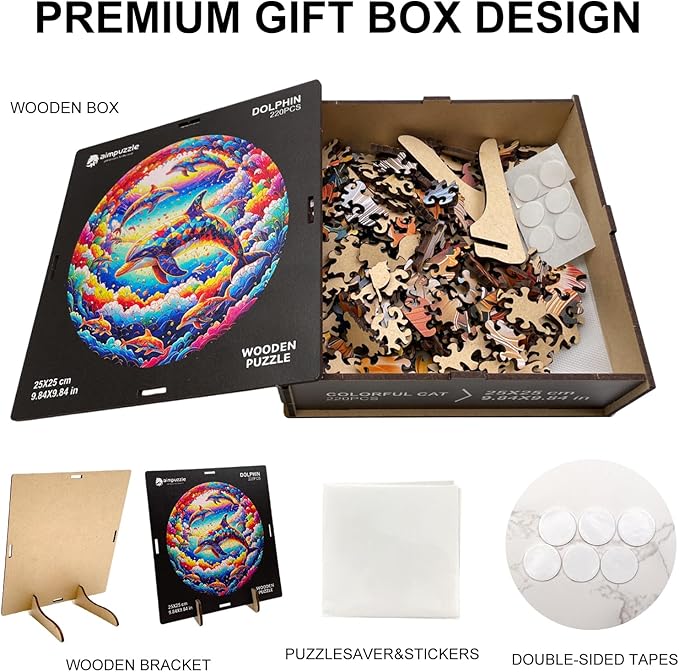 Wooden Puzzle for Adults โ Unique Dolphin-Shaped Jigsaw, Colorful Ocean Animal Design Brain Teaser for Kid & Teen, 220 Pieces, 10"x10", Ships as Whole Puzzle Board, Gift-Ready Box, Fun Family Game