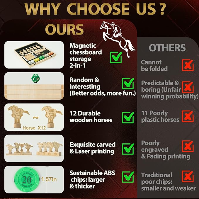 - Abundant Horse Racing Accessories - This complete magnetic horse racing game set includes everything you need: a magnetic & foldable solid wood board, 12 durable magnetic wooden horses, 1 creative podium,1 flexible horse injured area, 2 twelve-sided dice (with 1 backup), 100 bigger and thickened chips for better grip and feel, 2 poker and a clear instruction guide, all packed in a compact, reliable packaging. Ready for fun!