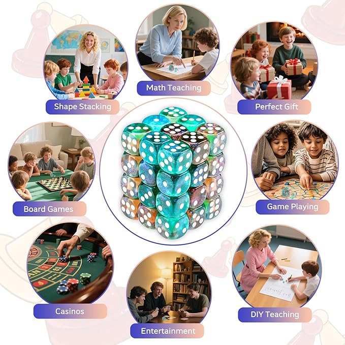 - Wide Range of Application: Board Games Dice,Durable dice set for classic games like Craps, Yahtzee, Backgammon, Boggle, Monopoly, Dungeons and Dragons, Tenzi, Liar's Dice, Farkle, Bunco, and so much more!,dice also make excellent Teacher's aids,Perfect item for playing at home with your family or at a party.